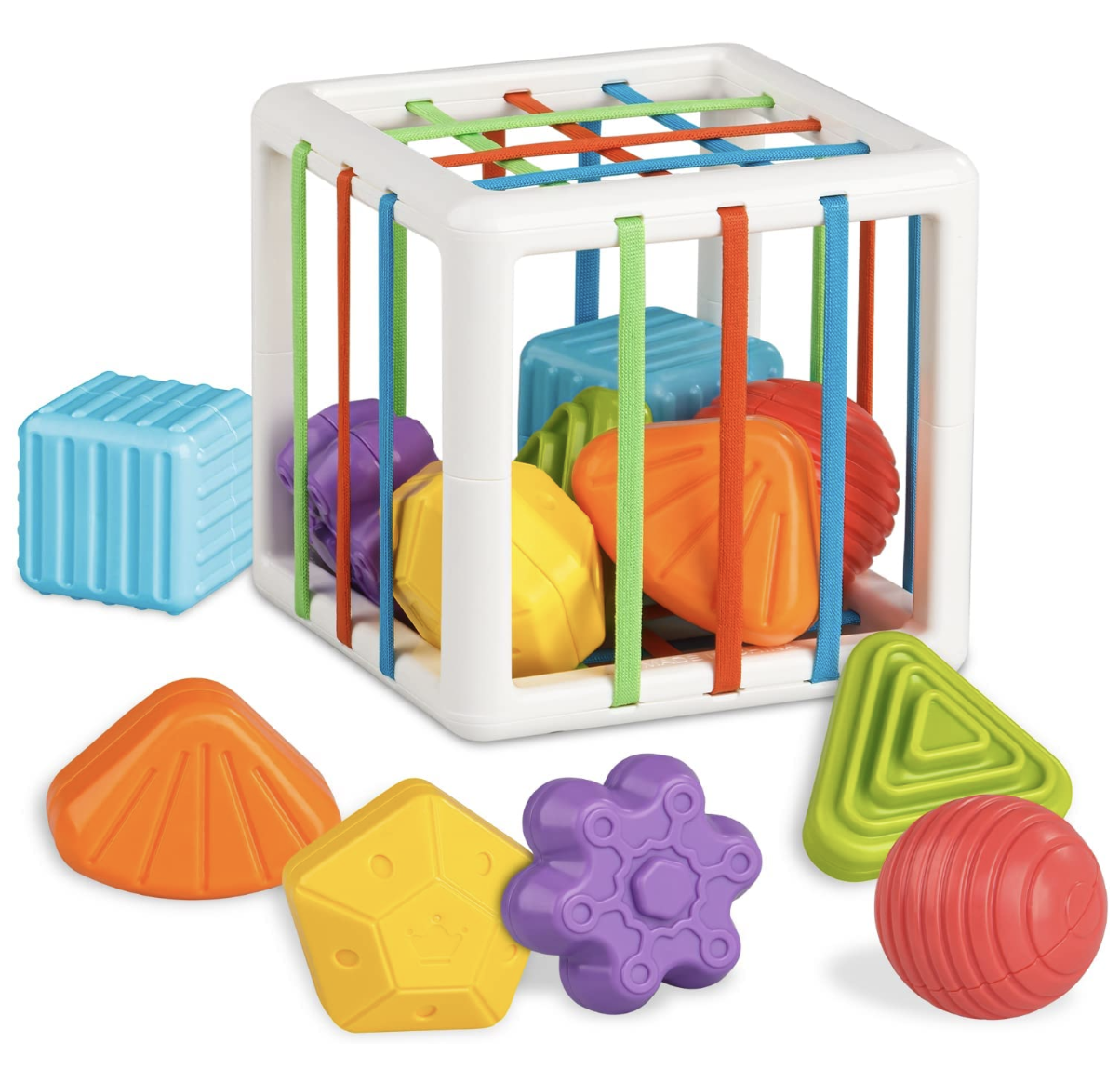 Montessori Toys for 1 Year Old, Cube Bin & 6 Sensory Shape Blocks
